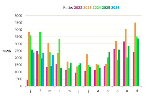Dans la période janvier-mars 2026 la production s’élevait à 6905 MWh (= la consommation moyenne de 7892 familles en trois mois).