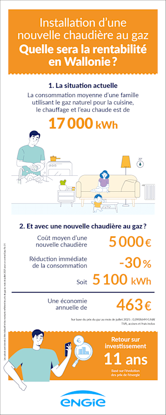 Vous ne devez pas sacrifier votre confort pour faire des économies de chauffage, même si votre bâtiment n’est pas adapté à une pompe à chaleur. Avec une nouvelle chaudière à condensation au gaz, comme plus de deux millions de Belges, vous pouvez consommer jusqu’à 30% de moins !
