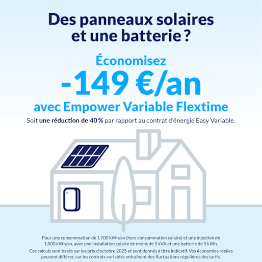 Combien ? Avec Empower Flextime, vous pouvez économiser jusqu’à 149 euros par an, soit 40% de réduction par rapport au contrat Easy Variable, avec une consommation de 1700 kWh (prélèvement) et une injection de 1800 kWh par an.