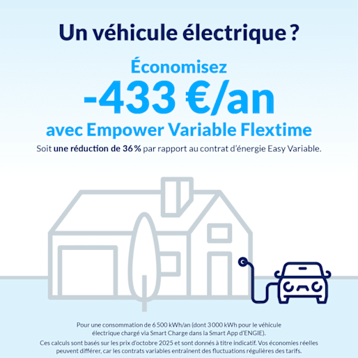 Le secret ? Ce sont les heures super-creuses du contrat Empower, qui offrent le tarif le plus bas du marché à des créneaux fixes et prévisibles. La cerise sur le gâteau, c’est que vous pouvez déléguer la recharge de votre véhicule au service Smart Charge de la Smart App d’ENGIE : votre voiture se recharge alors automatiquement pendant ces plages horaires ultra-avantageuses. Vous branchez simplement votre véhicule quand vous voulez, puis vous définissez votre heure de départ souhaitée, et le service Smart Charge s’occupe de tout, même de vos économies.