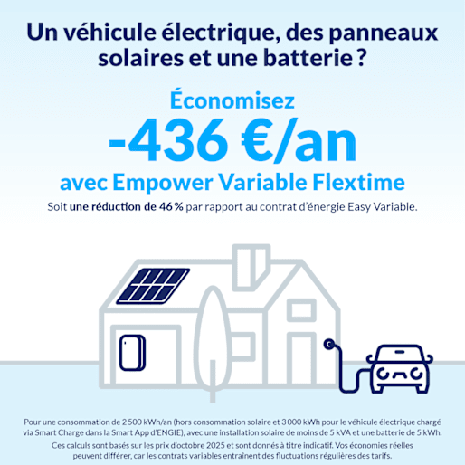 C’est la combinaison optimale ! Certes, vous avez une consommation plus élevée, en raison de votre voiture électrique, mais, justement, vous disposez des équipements (panneaux solaires et batterie domestique intelligente) et des outils parfaits (Smart Charge de la Smart App) pour optimiser votre consommation, le tout associé au contrat Empower Flextime et à ses heures super-creuses (et avantageuses).