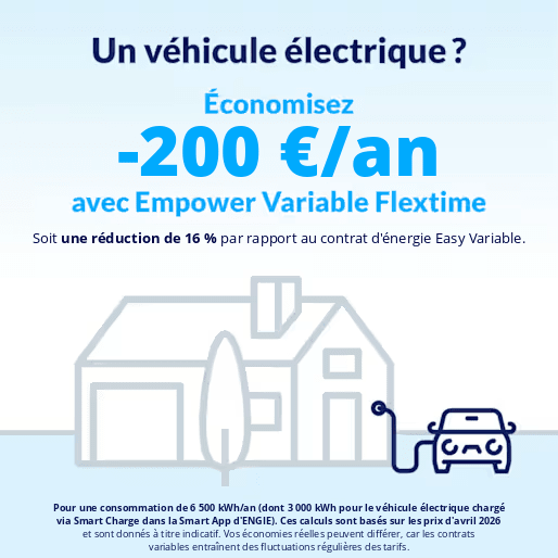Le secret ? Ce sont les heures super-creuses du contrat Empower, qui offrent le tarif le plus bas du marché à des créneaux fixes et prévisibles. La cerise sur le gâteau, c’est que vous pouvez déléguer la recharge de votre véhicule au service Smart Charge de la Smart App d’ENGIE : votre voiture se recharge alors automatiquement pendant ces plages horaires ultra-avantageuses. Vous branchez simplement votre véhicule quand vous voulez, puis vous définissez votre heure de départ souhaitée, et le service Smart Charge s’occupe de tout, même de vos économies.