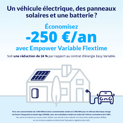 C’est la combinaison optimale ! Certes, vous avez une consommation plus élevée, en raison de votre voiture électrique, mais, justement, vous disposez des équipements (panneaux solaires et batterie domestique intelligente) et des outils parfaits (Smart Charge de la Smart App) pour optimiser votre consommation, le tout associé au contrat Empower Flextime et à ses heures super-creuses (et avantageuses).