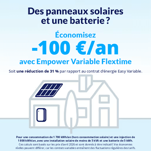 Combien ? Avec Empower Flextime, vous pouvez économiser jusqu’à 100 euros par an, soit 31% de réduction par rapport au contrat Easy Variable, avec une consommation de 1700 kWh (prélèvement) et une injection de 1800 kWh par an.