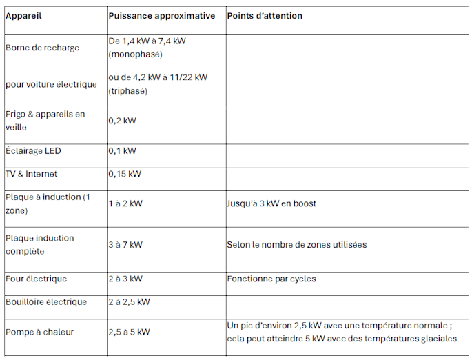 Dans ce cas, le pic estimé sera donc d’environ 14,5 kW, c’est-à-dire 3,7 + 2,3 + 3 + 2 + 3 + 0,5.