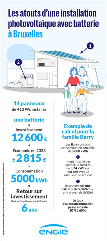 Et si vous ajoutiez une batterie à votre installation ? La question est pertinente, et ce même en l’absence de prime ! Vous augmentez considérablement votre autoconsommation, en moyenne de 30 % à 60 % ; vous êtes plus indépendant vis-à-vis des changements de législations ; et vous faites plus d’économies. La réponse en image :
