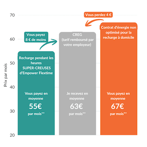En chargeant pendant les heures SUPER-CREUSES, vous payez encore moins et évitez toute perte d’argent.