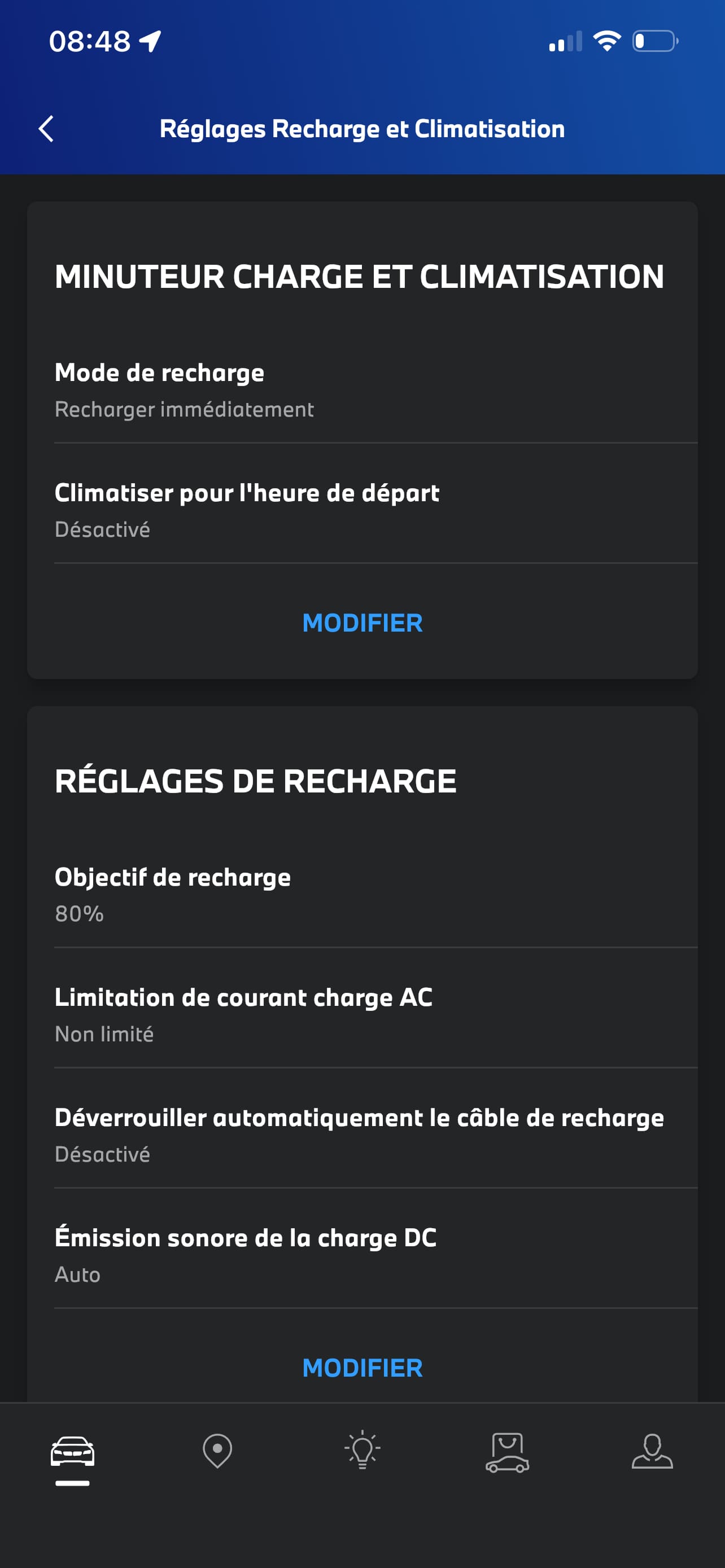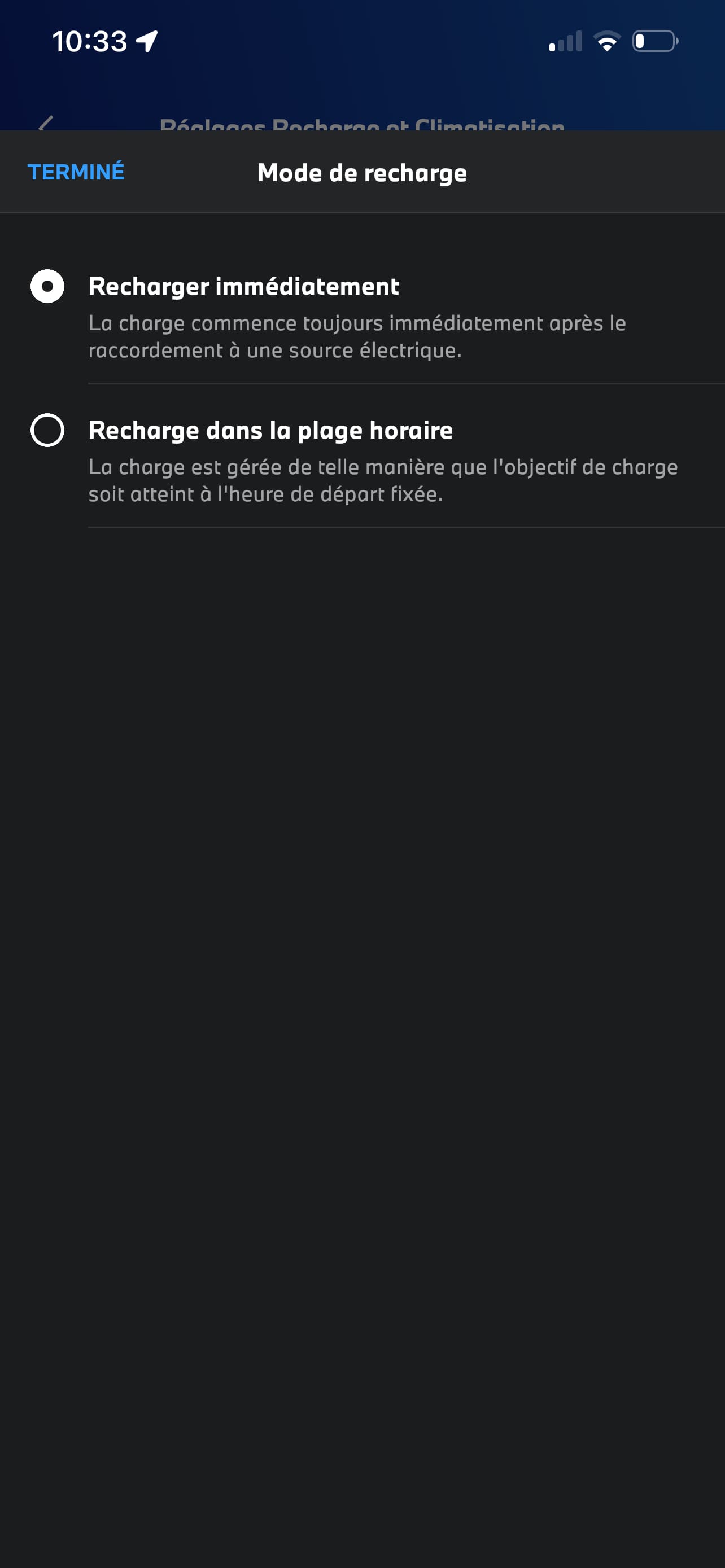Etape 1 : Allez vers ‘Recharge’ puis choisissez ‘Règlages Recharge et Climatisation’