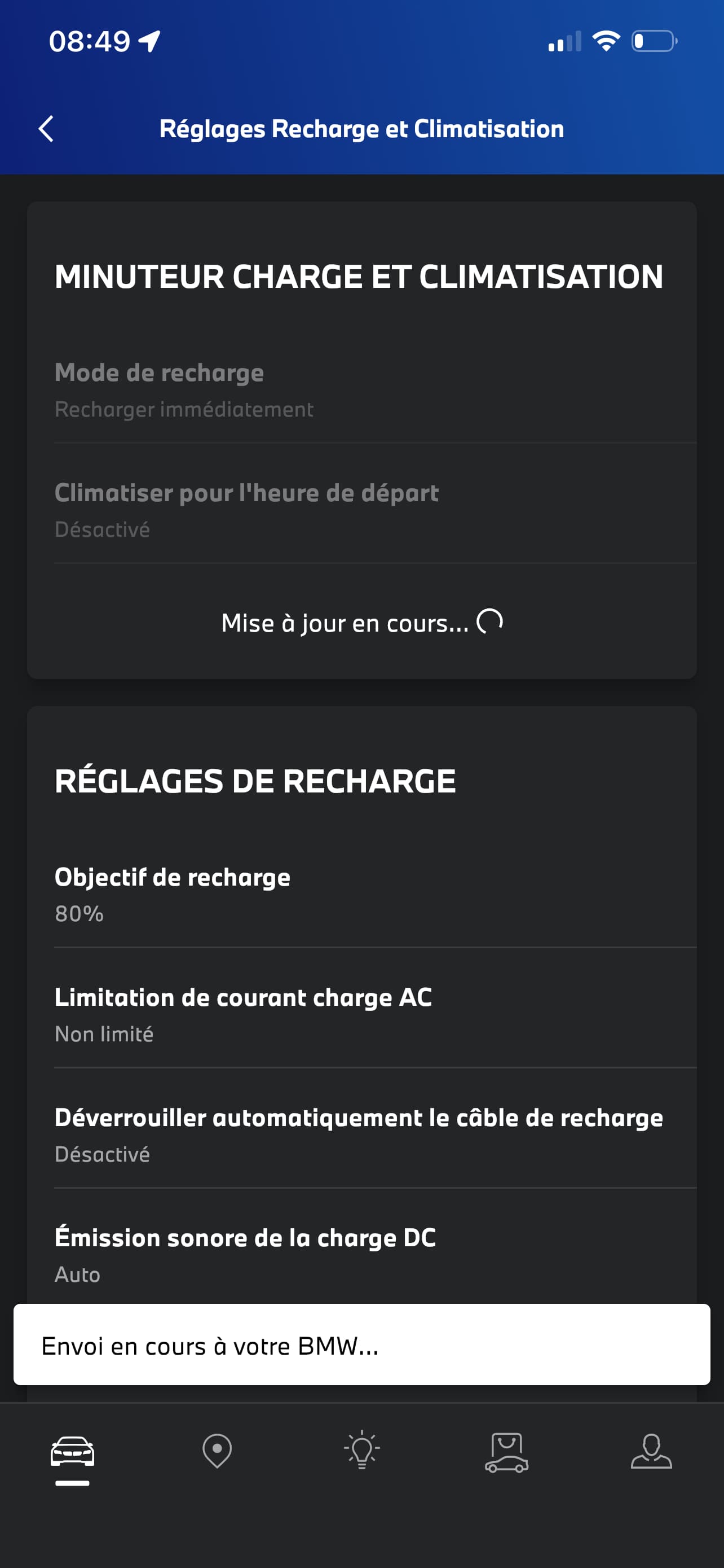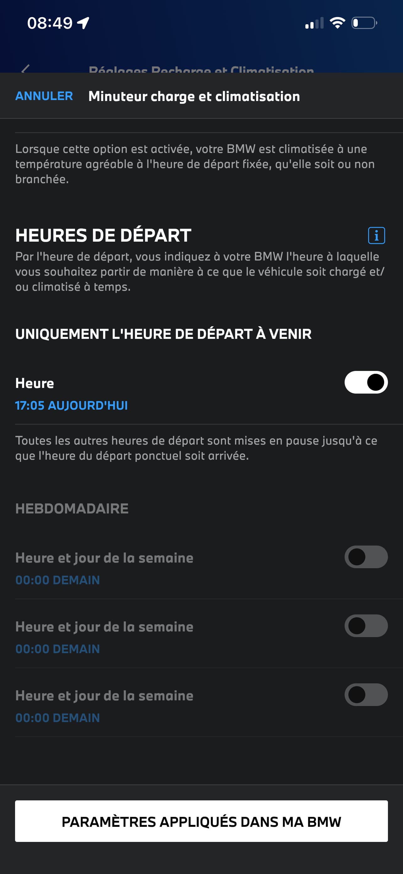 BMW a choisi de ne permettre le réglage de votre heure de départ ou objectif de recharge que via l’application My BMW.