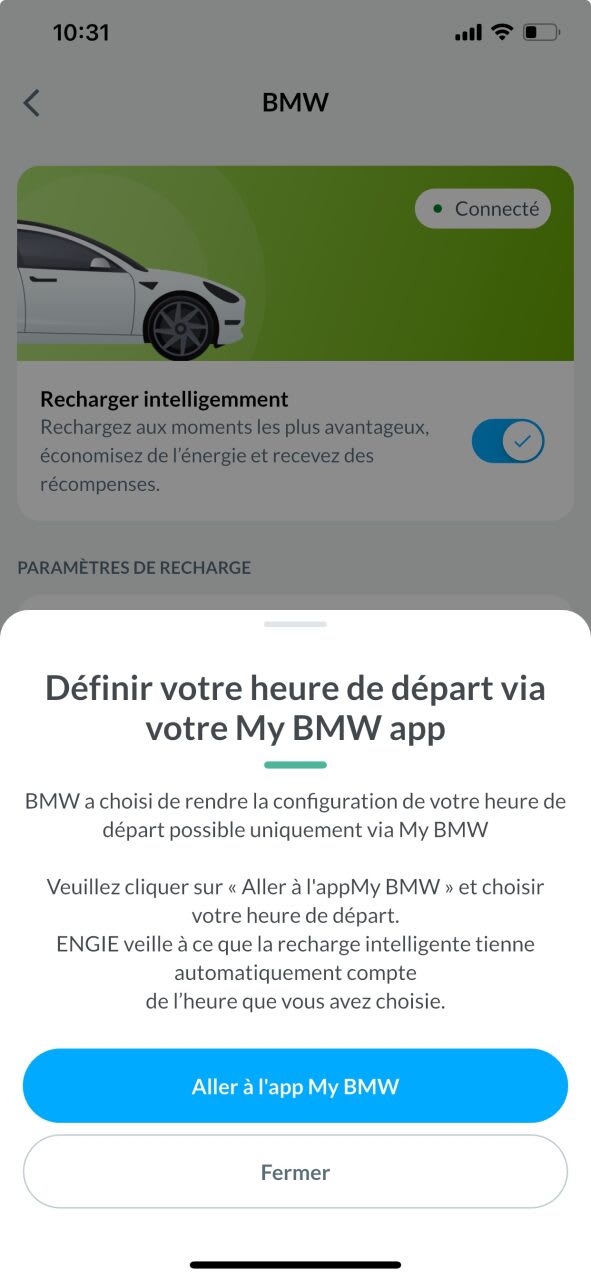 Cliquez sur “Aller vers l’application My BMW” et choisissez votre heure de départ. ENGIE veillera à ce que la Recharge Intelligente en tienne automatiquement compte. »
