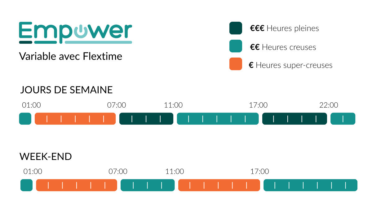 Contrairement aux contrats classiques, Empower Pro Flextime introduit trois plages tarifaires fixes selon les jours de la semaine, offrant une meilleure adaptation aux besoins et aux profils de consommation des clients