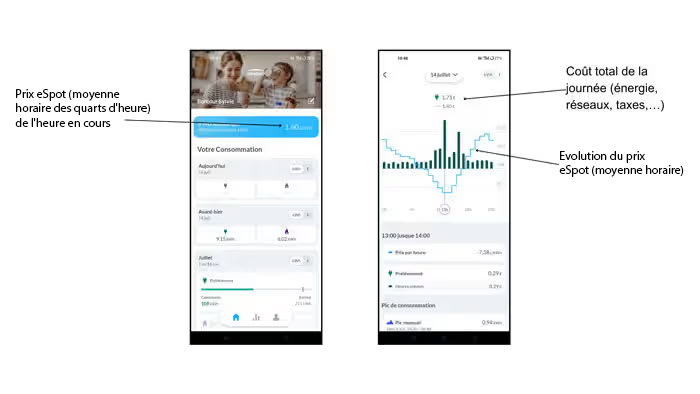 1. Prix eSpot_15 : Le prix affiché dans l'encadré bleu de votre page d'accueil sur l'application correspond au prix eSpot_15 moyen de l'heure en cours.