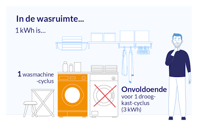 Van de woonkamer naar je wasmachine: hoeveel wasbeurten levert 1 kWh op? Slechts één enkele en dan nog zonder te drogen! Want om één keer een volle droogkast te laten draaien, heb je 3 kilowatuur nodig.