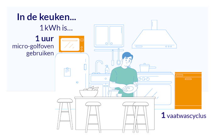 Zo zijn we in de keuken beland, die vol staat met onmisbare, maar energieverslindende toestellen, zoals je koelkast, oven, microgolfoven en vaatwasser. Met 1 kWh kom je hier echt niet ver!