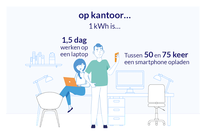Ben je dankzij die magische kilowattuur op kantoor geraakt? Ook daar zou vrijwel niets werken zonder stroom. Je hebt bijvoorbeeld 1 kWh nodig om anderhalve dag op je laptop te werken. Of je kan er tot 75 keer je smartphone mee opladen.