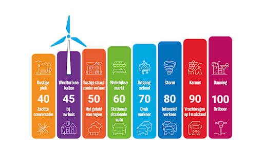De reglementering bepaalt ook de minimale afstand tot een windturbine: 600 meter in woongebieden, 400 meter voor een vrijstaande woning bij een 200 meter hoge windturbine. En hoe verder je weggaat, hoe zachter het geluid wordt.