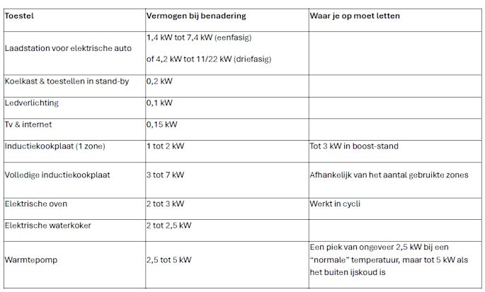Wil je liever zelf je verbruikspieken bepalen? Daarvoor hoef je alleen maar het vermogen op te tellen van alle toestellen die gewoonlijk samen ingeschakeld zijn tijdens een bepaald kwartier