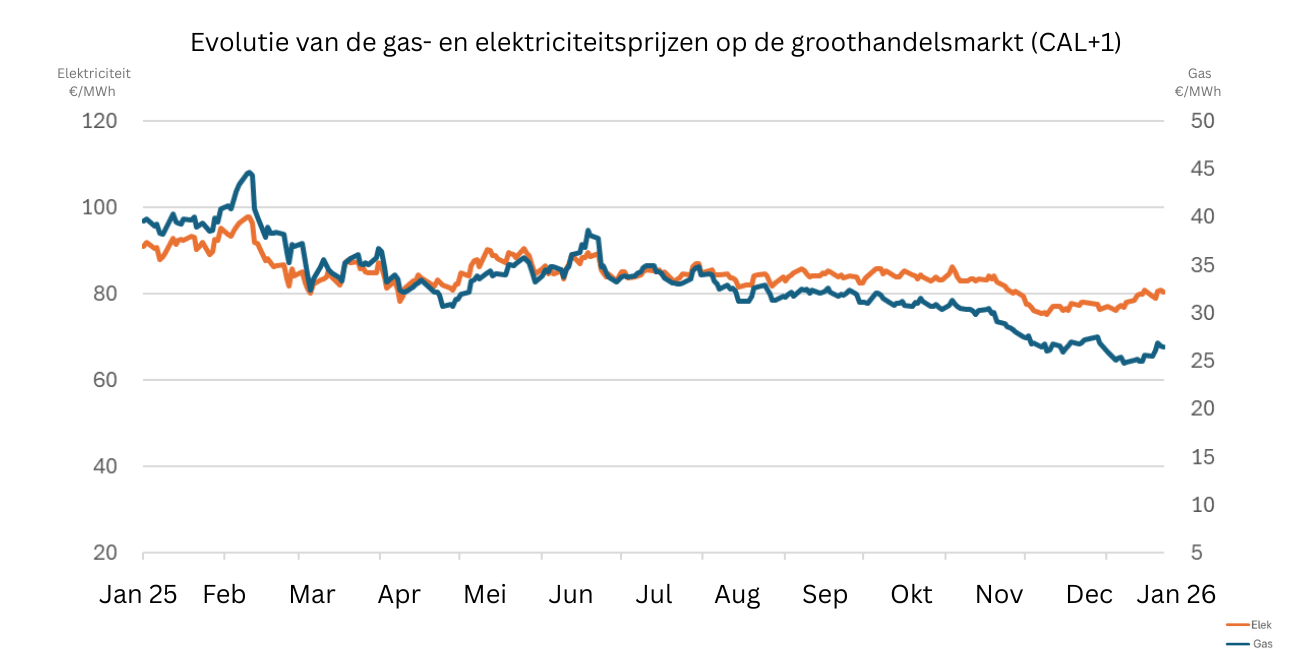 Het jaar 2025 begon in een gespannen context. De energieprijzen gingen omhoog, onder andere door werken aan de netten, hogere transportkosten en internationale spanningen. Gelukkig kwam daar vanaf het voorjaar verandering in. Dankzij meer geopolitieke rust, zachter weer en goed gevulde gasvoorraden daalden de prijzen geleidelijk.
